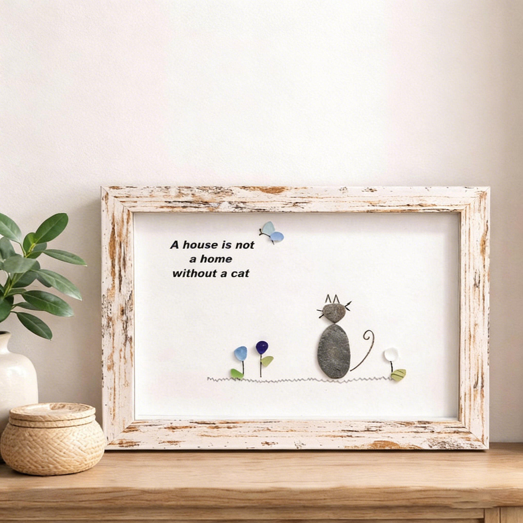 Created with natural pebbles and genuine seaglass, this charming design makes the perfect gift for cat lovers and cat moms. A sweet, thoughtful addition to any cozy home.