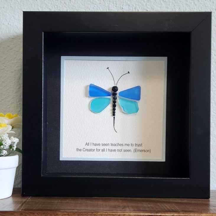 This colorful piece of art is a perfect gift for any occasion or any room. The wings are made from sea glass and small black glass pebbles are used for the body. The inspirational saying is printed below the butterfly.
