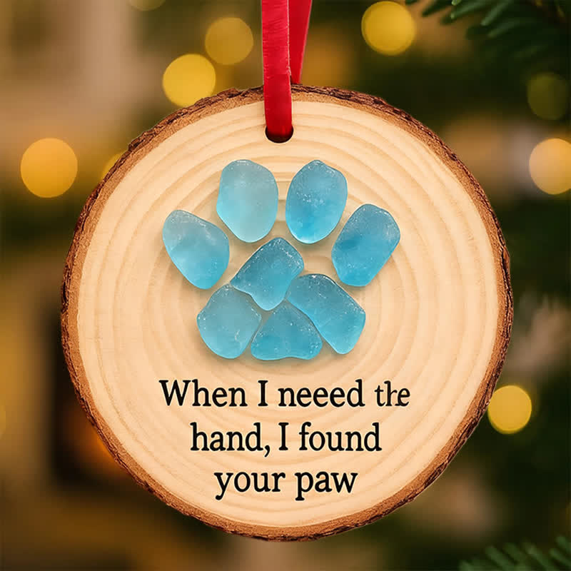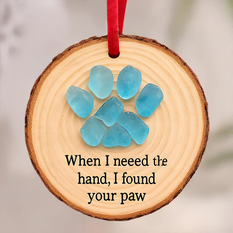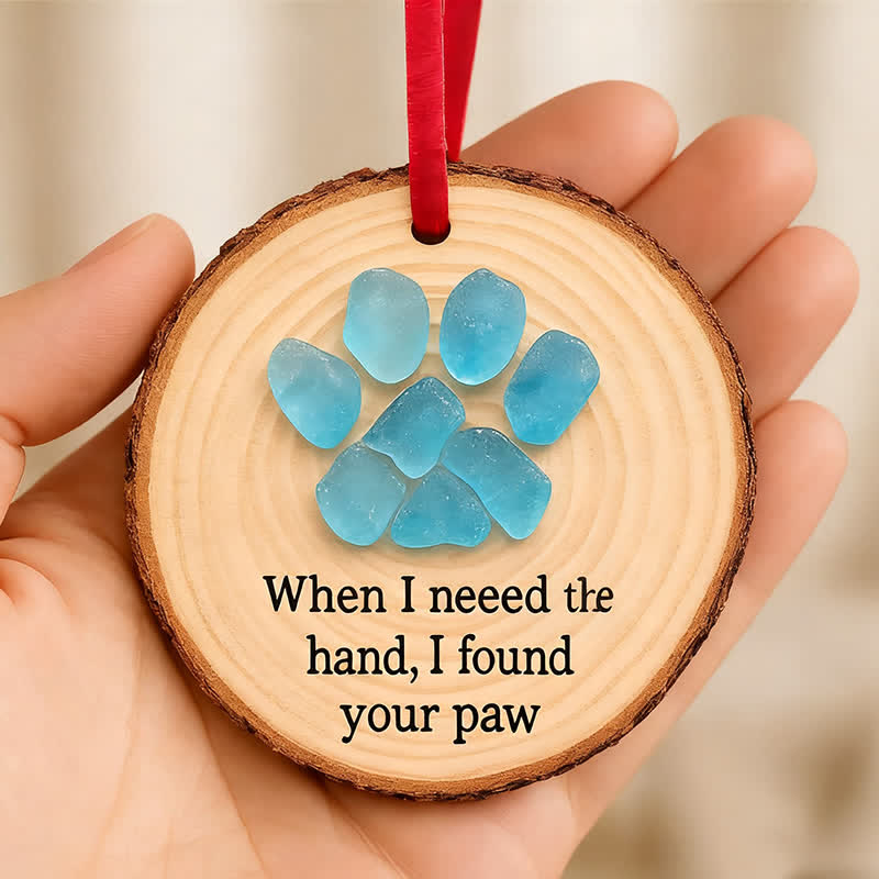 🐾This unique ornament features a charming paw print crafted from shimmering sea glass, set against a natural wooden slice. The heartfelt phrase "When I need the hand, I found your paw" beautifully captures the special bond between humans and their beloved pets. 💕