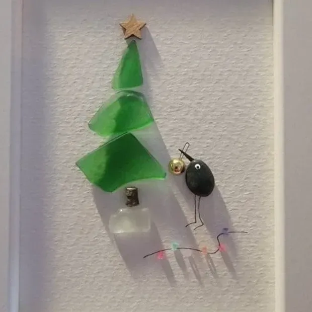 This beautiful sea glass pebble artwork features a Christmas tree crafted from sea glass. Next to the tree, a little bird made of pebbles holds a golden Christmas ornament in its beak. A festive glass garland lies nearby.It's a charming sea glass picture!